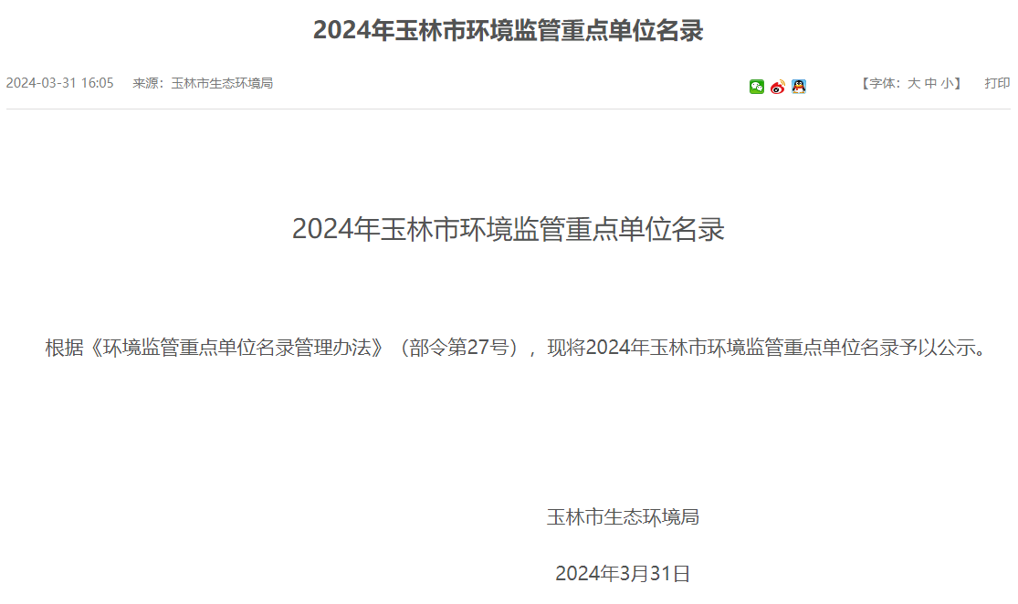 時(shí)間:04/09/2024 05:44:152024年3月31日,玉林市生態(tài)環(huán)境局公布《2024年玉林市環(huán)境監(jiān)管重點(diǎn)單位名錄》。