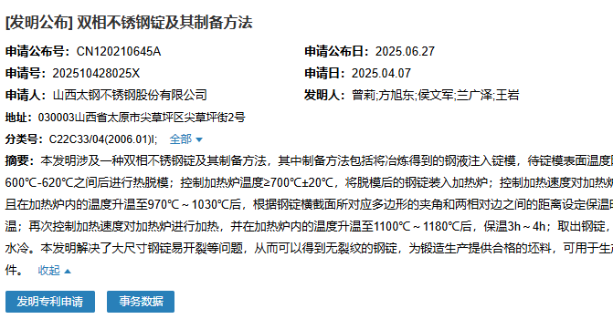山西太鋼成功申請(qǐng)一項(xiàng)名為“雙相不銹鋼管坯及其制備方法”專(zhuān)利