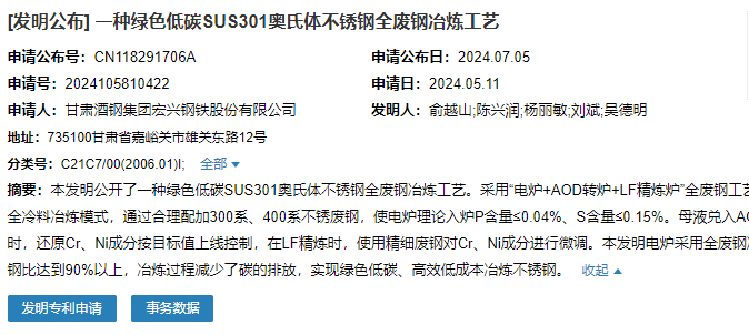 時間:07/06/2024 06:04:072024年7月5日,甘肅酒鋼集團(tuán)宏興鋼鐵股份有限公司成功申請一項名為“一種綠色低碳SUS301奧氏體不銹鋼全廢鋼冶煉工藝”專利,申請公布號CN118291706A,申請日期為2024年5月11日。